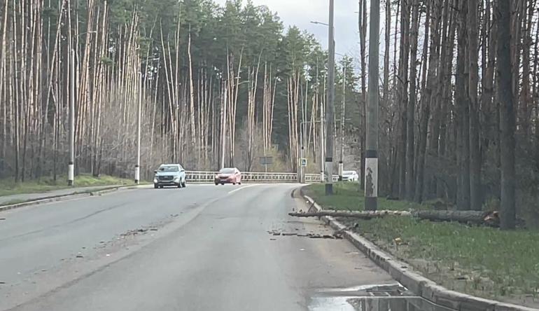 Предварительно, в результате сильного ветра, сосна упала на проезжавший мимо автомобиль KIA Rio. В результате дерево сломалось об машину пополам, а автомобиль получил серьезные повреждения. У «корейца» разбито лобовое стекло, помят капот и повреждена фара.