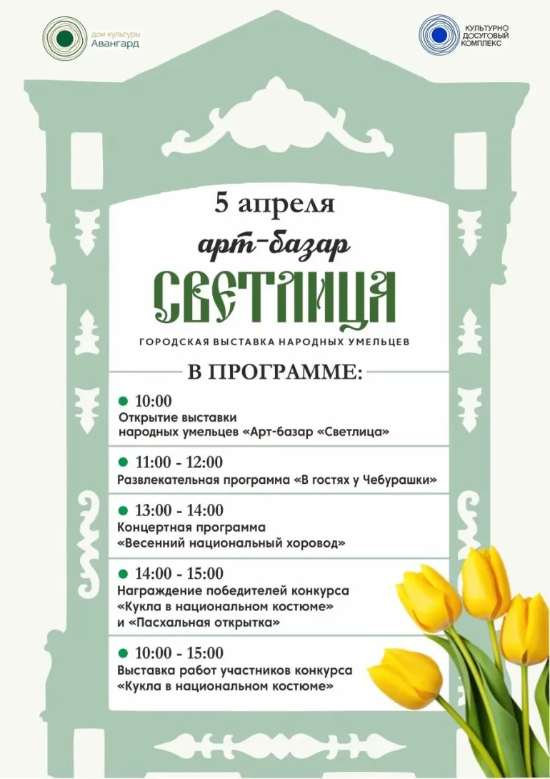 В воскресенье, 5 апреля, с 10 до 15 часов в ДК «Авангард» пройдет городской арт‑базар «Светлица» - выставка народных умельцев, приуроченная к Пасхе. Мероприятие соберет более 70 мастеров из Самарской области: гости смогут увидеть и приобрести уникальные изделия ручной работы - сувениры, произведения искусства и другие творческие работы.