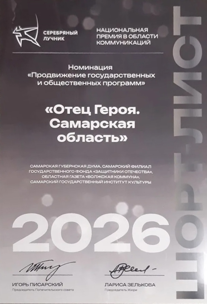 Высокую оценку экспертного жюри и профессионального сообщества получил проект «Отец Героя. Самарская область», реализованный Самарской Губернской Думой под руководством её председателя, академика РАН Геннадия Котельникова, совместно с филиалом Государственного фонда «Защитники Отечества», областной газетой «Волжская коммуна» и Самарским государственным институтом культуры. Проект рассказывает о героизме сыновей и мужестве отцов, о преемственности поколений, о семьях, где главные ценности — любовь к Родине и служение Отечеству. В областном парламенте была развёрнута фотовыставка портретов отцов, чьи сыновья героически погибли в ходе специальной военной операции.