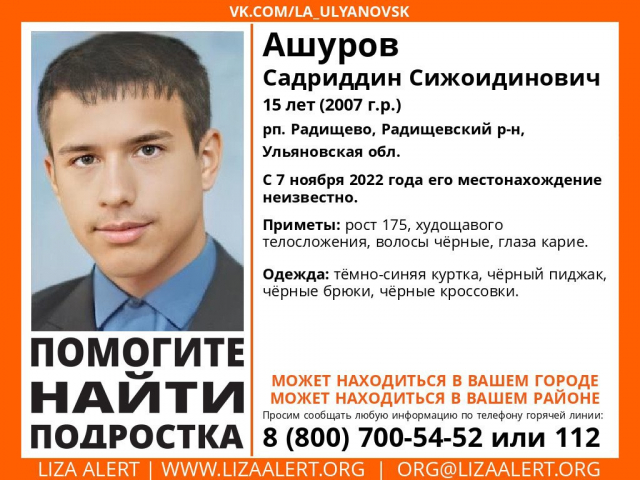 Найден пропавший 15-летний Садриддин Ашуров. Напомним, житель поселка Радищево пропал 7 ноября. В этот день девятиклассник пошел провожать в детский сад брата, а затем не появился в школе. После этого ориентировку на пропавшего распространил поисковый отряд «Лиза Алерт».
