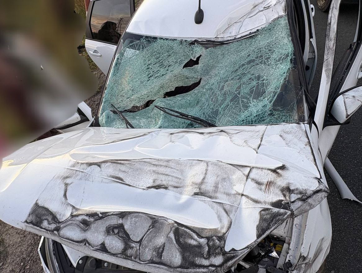 Как видно на фото, металл разнес лобовое стекло, оставив в нем огромную дыру. В результате происшествия, которое отчасти напоминает сцену из фильма ужасов «Пункт назначения», водитель и пассажир легкового авто обратились за разовой медицинской помощью прямо на месте происшествия.