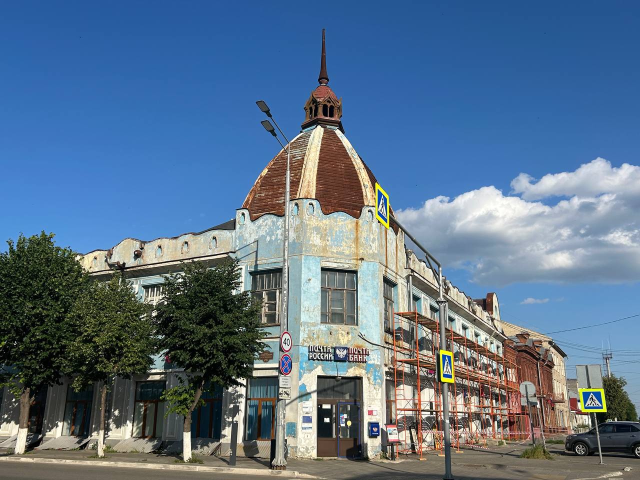 В центре Сызрани торговый дом Пермяковой, где сейчас располагается почтовое отделение, оброс строительными лесами. На прошлой неделе начался капитальный ремонт фасада здания и крыши этого исторического здания, расположенного на главной улице города - Советской.