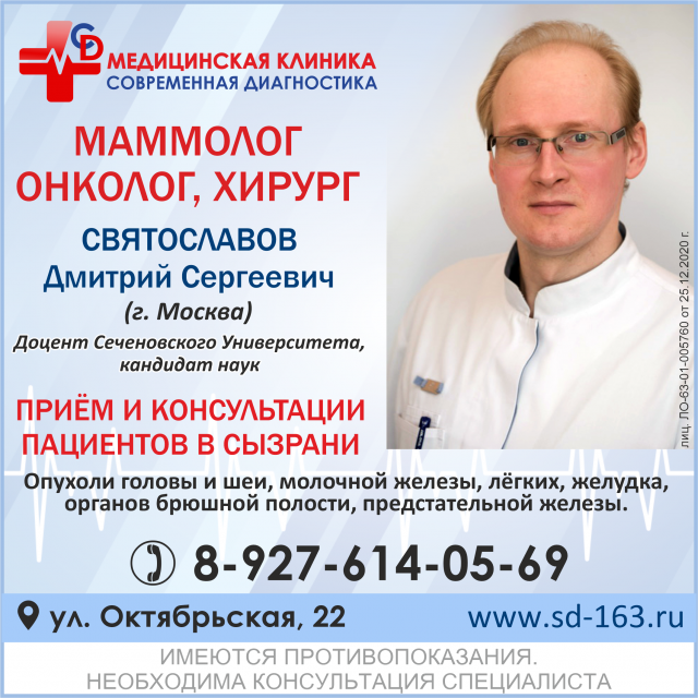 Дмитрий Святославов проведет прием в медицинской клинике «Современная диагностика» по адресу: г. Сызрань, ул. Октябрьская 22. Предварительная запись по телефону: 8-927-614-05-69.