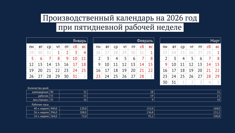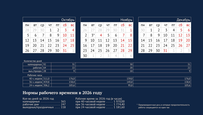 В 2026 году в целом при пятидневной рабочей неделе с двумя выходными днями будет 247 рабочих дней, в том числе четыре сокращенных на один час рабочих дня и 118 выходных и нерабочих праздничных дней.