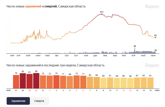 В Самарской области динамика распространения коронавируса застыла на одном месте. В регионе двое суток подряд умирают по 10 зараженных. Согласно данным федерального оперативного штаба по борьбе с распространением заболевания, с начала пандемии в области скончались 2 131 человек, а беспрерывная череда смертей продолжается 86 дней подряд.