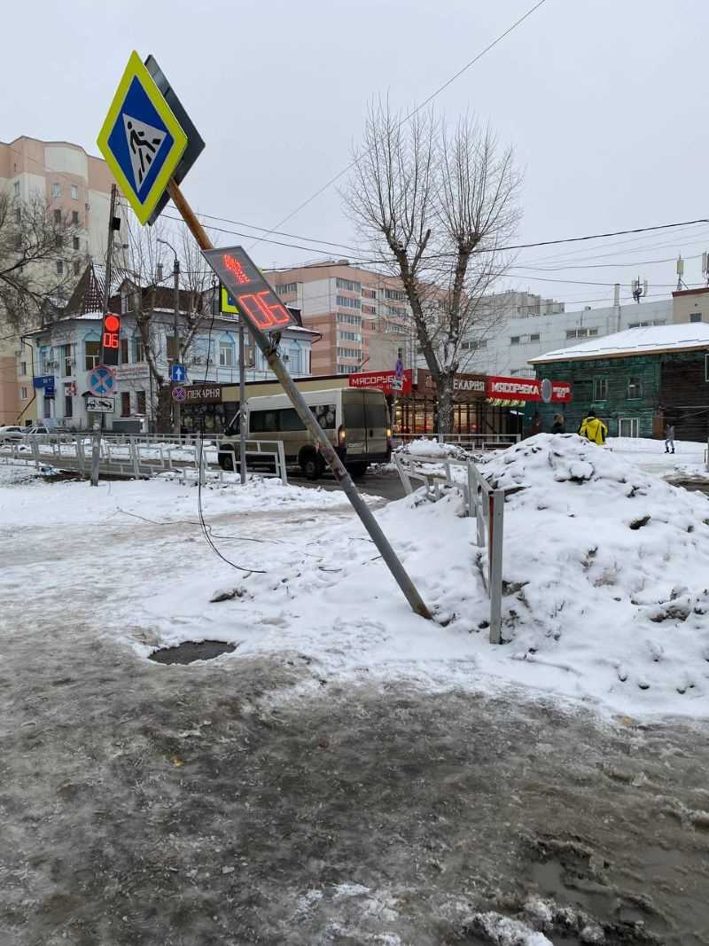 Горожане предполагают, что светофор могла сбить тяжелая техника при расчистке снега. Вместе с электронным регулировщиком оказался погнут металлический отбойник, ограждающий тротуар от проезжей части. При этом, как отмечают очевидцы, снег на Московской расчищен не качественно, а отвалы вдоль дороги достигают метра в ширину.