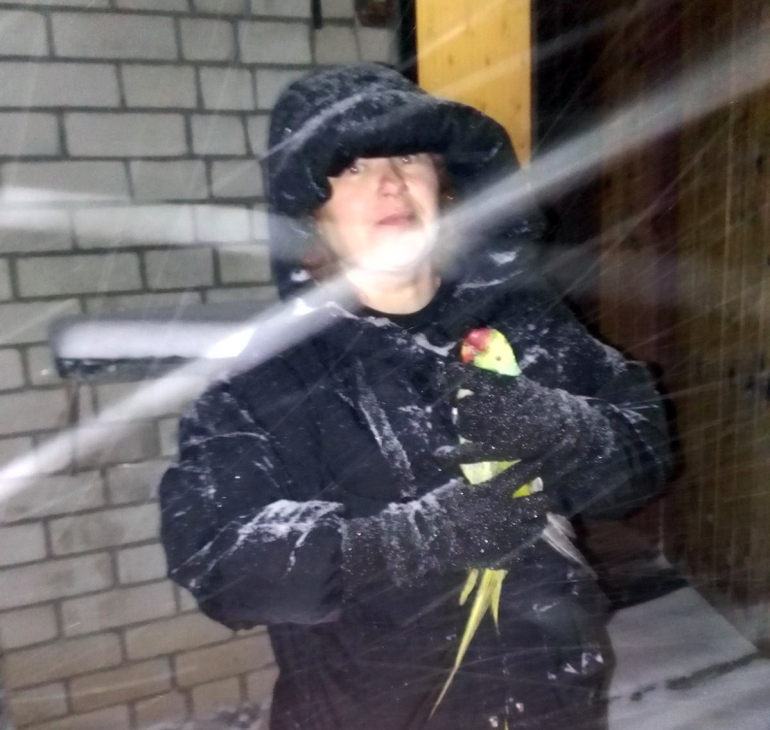– И вот удача! Вечером, 20 ноября мы поймали Ерика! – сообщила КТВ-ЛУЧ любительница животных и птиц Елена Ходорик. – Я и мой сын – ветеринарный врач Иван Александрович, а также моя приятельница Елена, ее муж и неравнодушная женщина Зоя Михайловна четыре дня ходили ловить Ерика! И вот в метель, четыре часа мы лазили по уши в снегу, стреляли в попугая снежками из специальной рогатки, с вальериса. Неравнодушные жители двора тоже помогали стрелять снежками, чтобы сбить попугая с веток.