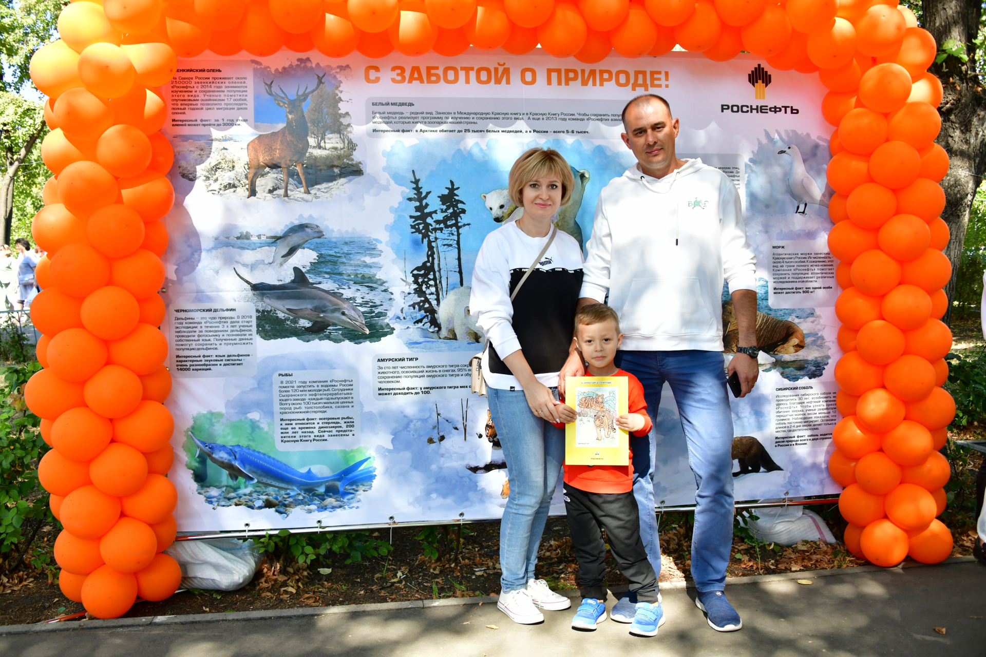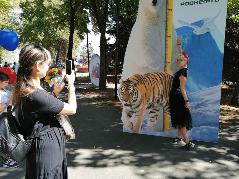 Семьи с детьми пришли на праздник 340-летия Сызрани и попали в необычный зоопарк. Парк – Кузнецкий, а животные - нарисованные в полный рост. Сравнить себя с огромным изображением белого медведя или амурского тигра было интересно не только детям, но и взрослым. Люди делали фото на память и погружались в познавательную игру. Детям раздавали рисунки редких животных, которые находятся под опекой компании «Роснефть».