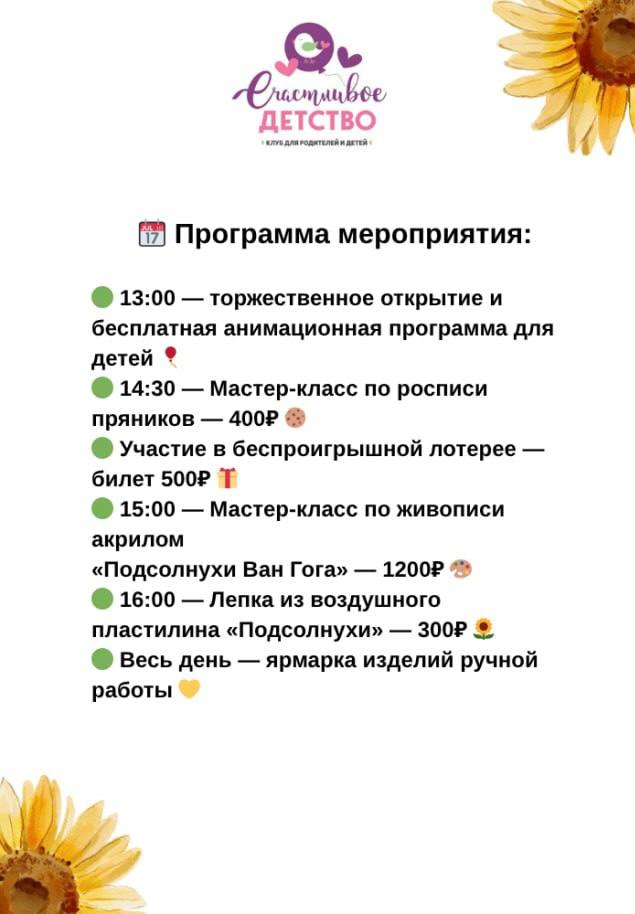 Мероприятие состоится в воскресенье, 5 октября, в клубе «Счастливое детство» по адресу: ул. Ульяновская, 2Б. С 13:00 до 18:00 гостей ждет насыщенная программа: торжественное открытие с детской анимацией, мастер-классы по росписи пряников, живописи акрилом «Подсолнухи Ван Гога» и лепка из воздушного пластилина. В течение всего дня будет работать ярмарка изделий ручной работы и беспроигрышная лотерея.