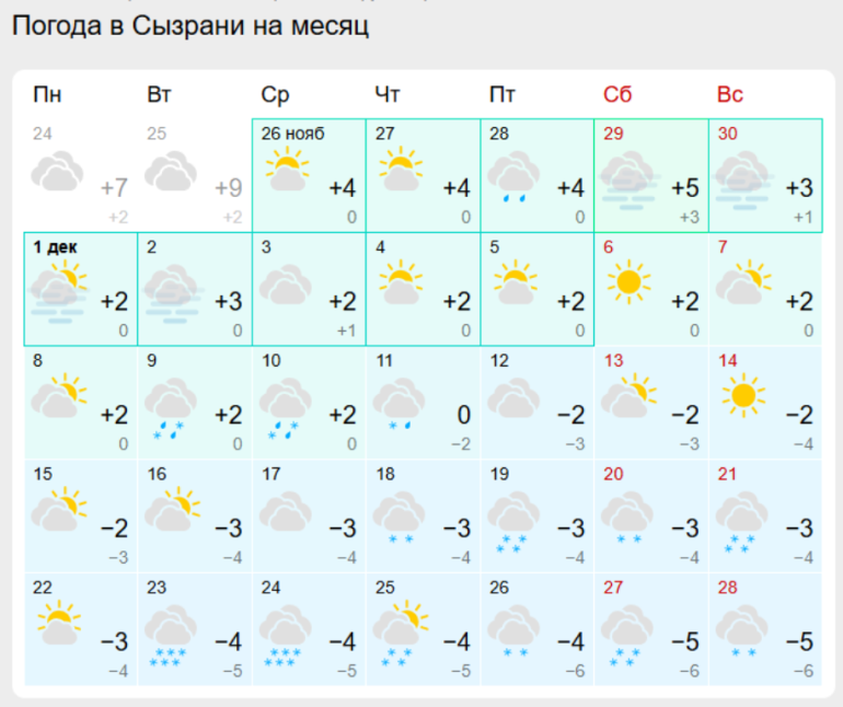По данным Gismeteo, небольшой снег без дождя при минусовой температуре может пойти в Сызрани лишь с 18 декабря. Сильный снегопад возможен в предпоследнюю неделю года - 23 и 24 декабря. При этом специалисты отмечают, что долгосрочные прогнозы не отличаются большой точностью и ситуация еще может существенно поменяться.