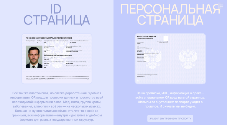 По словам авторов, новый паспорт станет универсальным и будет использоваться как внутри страны, так и за её пределами, то есть внутренний и заграничный паспорта объединят в один документ. Кроме того, на ID-странице предусмотрен QR-код с полной информацией о человеке, даже его группе крови и состояния здоровья.