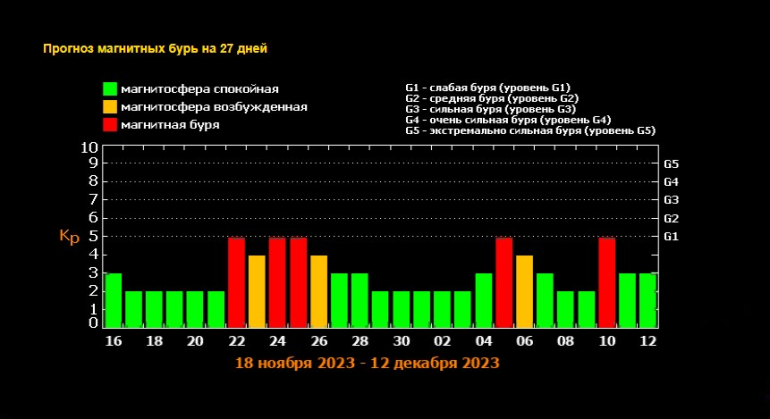 Вечером 21 ноября ожидается всплеск активности светила, что спровоцирует магнитную бурю уже в среду, 22 ноября. Магнитные бури будут происходить в следующие несколько дней, то чуть ослабевая, то вновь набирая силу. В стабильное состояние геомагнитная обстановка должна вернуться к 27 ноября.