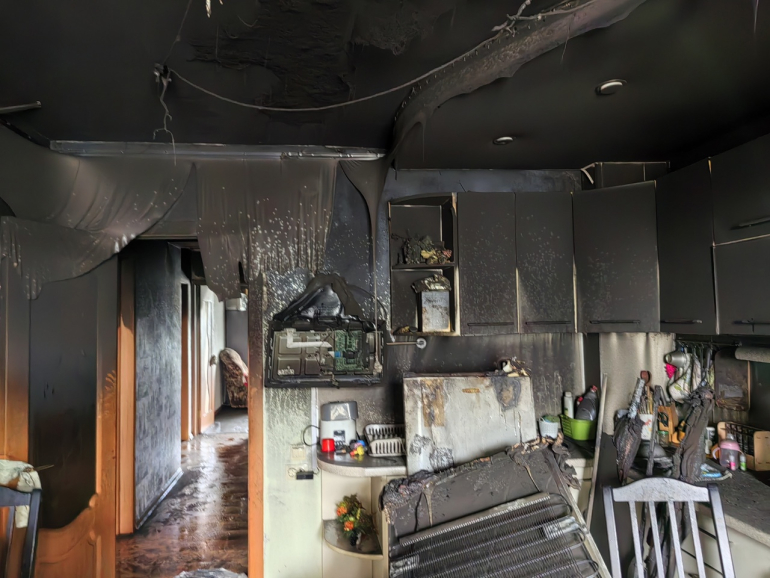 Как результат, пламя охватило кухню и балкон. А густой дым с копотью заполнили все помещение. Пожарным удалось быстро потушить огонь, но жить в квартире пока невозможно. Комнаты пропахли гарью, стены и потолки в саже, большая часть одежды, мебель также пострадали. Все это можно увидеть на кадрах из горевшей квартиры.