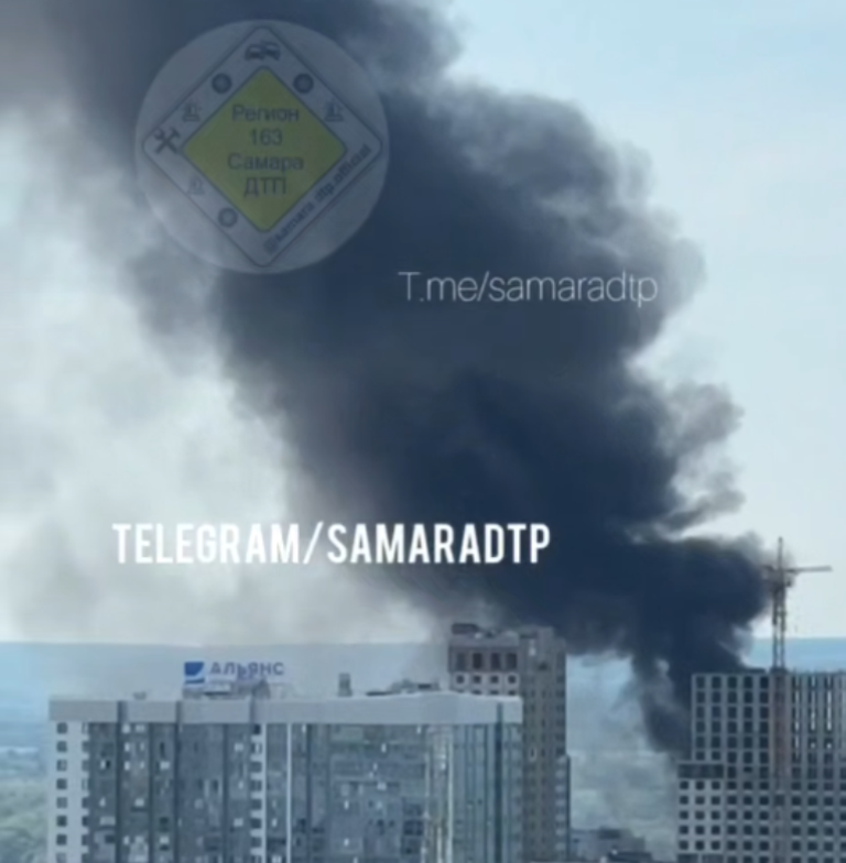 Огромный столб черного дыма поднимается среди строящихся высоток.
