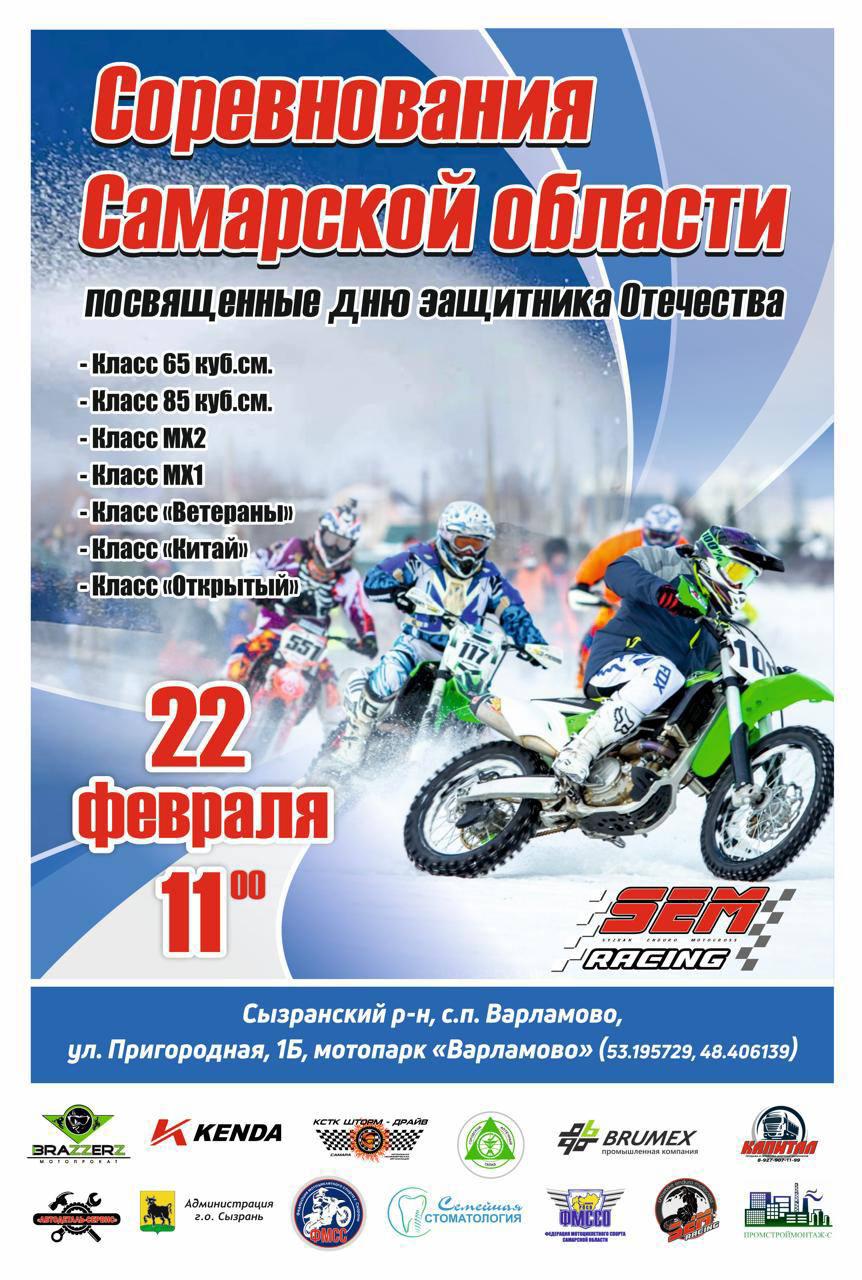 Под Сызранью 22 февраля пройдет открытый чемпионат Самарской области по мотокроссу, посвященный дню защитника Отечества. Гонщики будут соревноваться на подготовленном замкнутом треке с плотным снежным покрытием и искусственными неровностями. В зимних гонках примут участие спортсмены, разделенные на шесть классов по возрасту и объему двигателя мотоцикла.