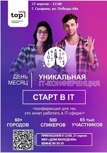 27 апреля 2024 года в Сызрани пройдет захватывающее событие - масштабная конференция «СТАРТ В IT*». Российская конференция «СТАРТ В IT» станет широким мостом для всех, кто стремится погрузиться в мир информационных технологий и сделать карьеру в данной отрасли. Это событие откроет двери в мир возможностей для всех желающих.