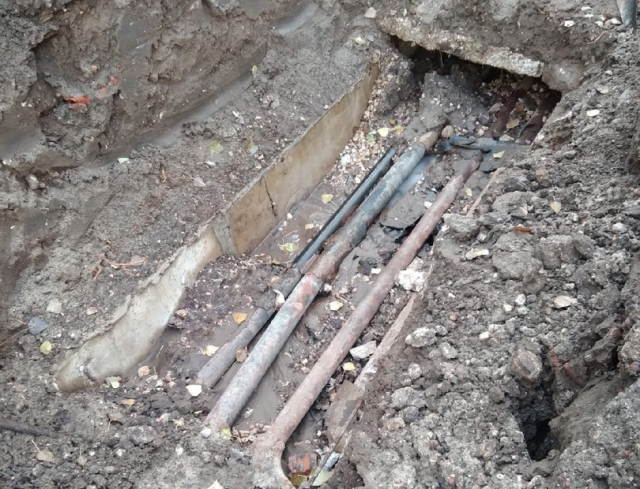 – Уже неделю в разрытых траншеях не могут нормально заменить трубы. Представитель управляющей компании сказал, что у ремонтников материалов нет. Приварили в гнилую трубу какие-то зеленые, голубые и желтые куски. Что это? Бывшие железные столбы? Почему новые трубы не используют? Рабочие приезжали, поработали и уехали, а вода сегодня хлещет в траншее, – рассказал корреспонденту КТВ-ЛУЧ местный житель Сергей.