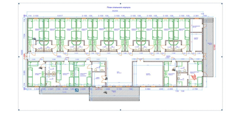 В модульном здании должно быть 14 жилых комнат на четырех и двух человек, в том числе для маломобильных детей. Также там должны уместиться комната воспитателя, игровая, холл, сушилка, техническое помещение и 15 санузлов.