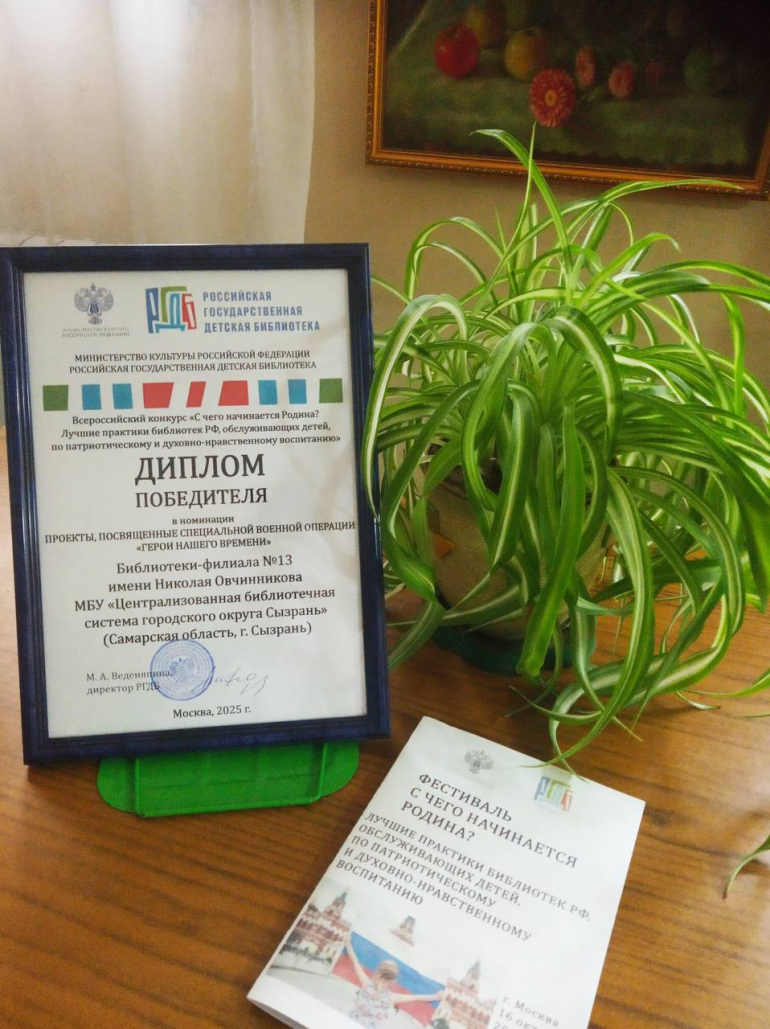 Сызранская библиотека-филиал № 13 имени Николая Овчинникова завоевала престижную победу в номинации, поссвященной СВО - «Герои нашего времени» Всероссийского конкурса "С чего начинается Родина?". Награждение победителей, включая автора идеи Анну Коптелову, состоялось в Москве, на территории организатора конкурса - в Российской государственной детской библиотеке.