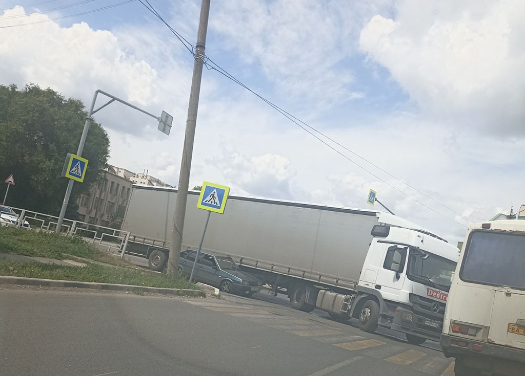 По предварительным данным, оба автомобиля двигались в попутном направлении. Видимо, водитель фуры собирался повернуть налево с левого ряда и не заметил в правом ряду стоящую «девятку».