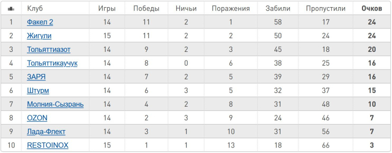 Лидируют в чемпионате ТЛХЛ с 24 очками сразу две команды - «Факел-2» и «Жигули». ХК «Тольяттиазот» с 20 баллами замыкает тройку лидеров.