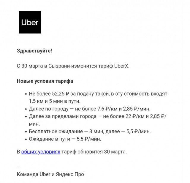 Сызранские таксисты сообщают о повышении цен на популярный тариф UberXв сервисе Uber. Поездка по такому тарифу аналогична «Эконому» в сервисе Яндекс Go. Правда, несмотря на рост ценника, особой радости этот факт у водителей не вызывает.