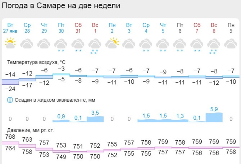Если во вторник, 27 января, оно находится на отметке в 768 мм ртутного столба, то уже в четверг, 29 января, упадет до 757 мм, а к субботе, 31 января рухнет до 751 мм. Такой прогноз для Самарской области дает Gismeteo.