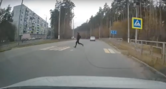 На кадрах видно, как из лесопосадки на проезжую часть неожиданно выбежал пешеход, промчался прямо перед капотом автомобиля и побежал дальше по своим делам, даже не обратив внимания на машину. Просто счастье, что водитель притормозил и сумел избежать наезда.