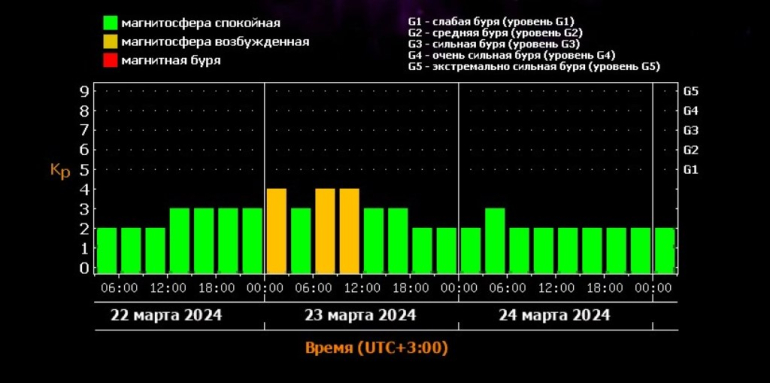Судя по прогнозам, слабая магнитная буря прогнозируется также в ночь на субботу и утром 23 марта.