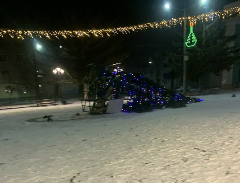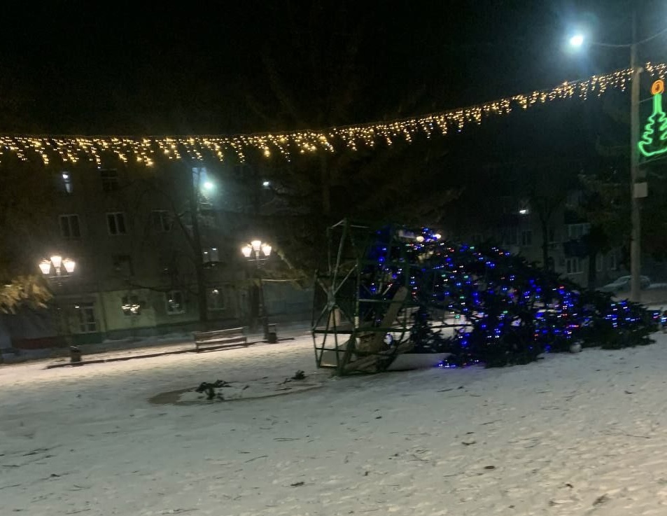 Как передают очевидцы, в районе местного дома культуры новогодняя ель не выдержала порывов ветра и рухнула. В момент падания людей рядом не было, теперь коммунальным службам предстоит восстановить украшение.