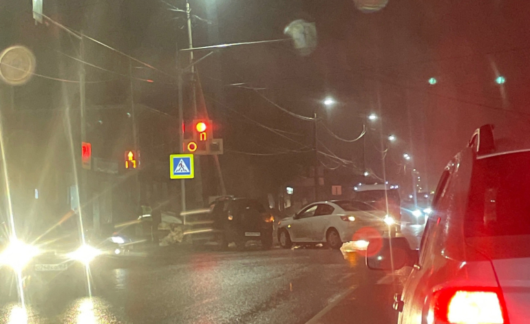 Очевидцы сообщают, что столкнулись два автомобиля. На фото видно, что белая иномарка основательно перегородила проезд на перекрестке и на этом участке дороги проезд затруднен.