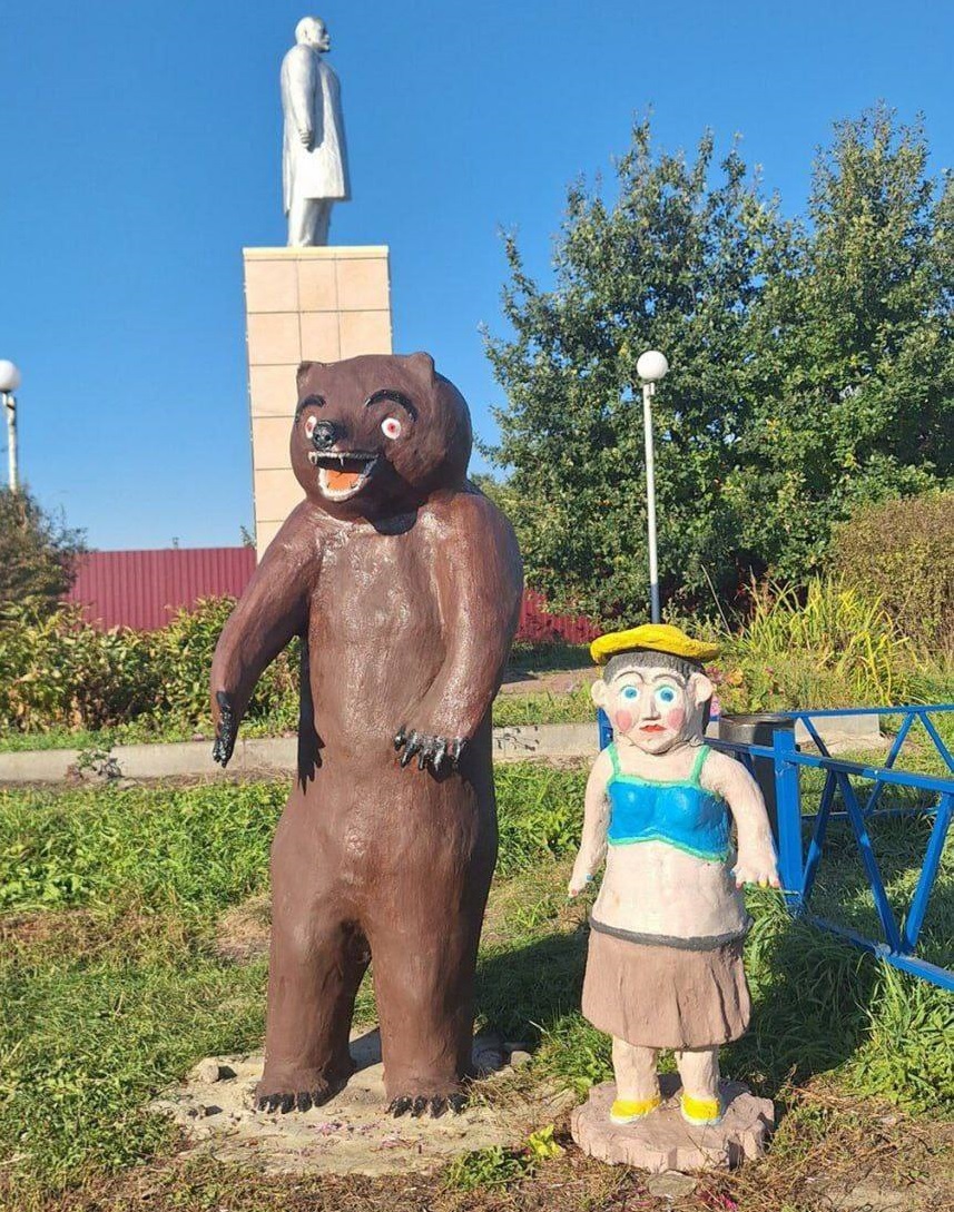 - Вновь отметились ульяновские художники: попробуйте сами догадаться, что сваяли на этот раз?! Правильный ответ: Маша и Медведь. Возможно, разгадка ужасного ужаса в том, что герои идут от Ильича, который провел с ними воспитательную работу и полностью их переколбасил. Особенно впечатляет девочка: у неё нет пупа, но зато чётко сформировалась грудь и присутствует денежный маникюр. Есть вопросы к ушам, выросшим на висках, а желтый блин на голове заставляет выдвигать самые смелые теории - вплоть до последствий медвежьей болезни у Топтыгина. От беседы с Лениным и не такое могло произойти! На этом фоне арабские бровищи у мишки напрягают слабо. Бабоньки приучили нас к такому уродству, - написал Сергей Стиллавин в своем telegram-канале.