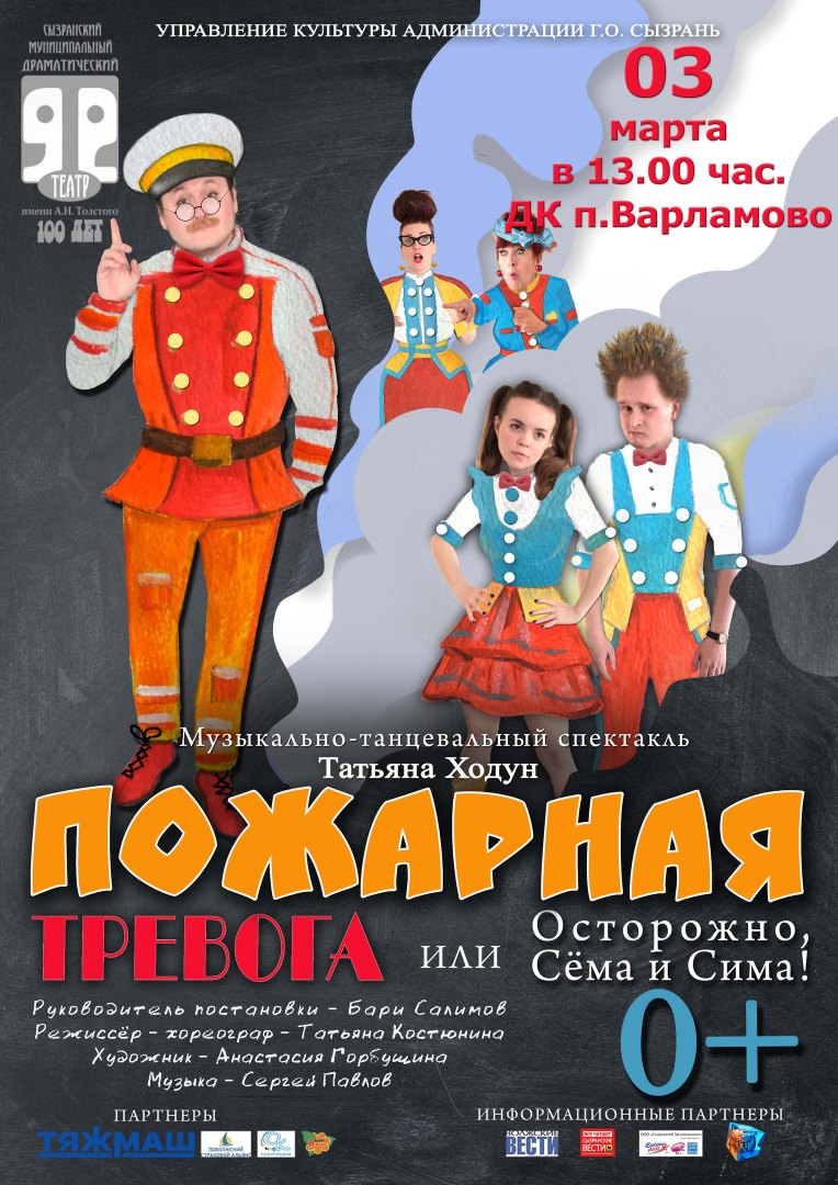 Во вторник, 3 марта, актеры Сызранского драматического театра покажут музыкально-танцевальный спектакль по пьесе Татьяны Ходун «Пожарная тревога или Осторожно, Сёма и Сима». Спектакль пройдет в доме культуры поселка Варламово.
