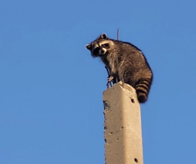 Очевидцы смогли запечатлеть такого верхолаза на фото. На снимках видно, как енот сидит на бетонном столбе. На одном из снимков у зверька очень удивленный вид, видимо, он не ожидал, что ему утроят фотосессию.