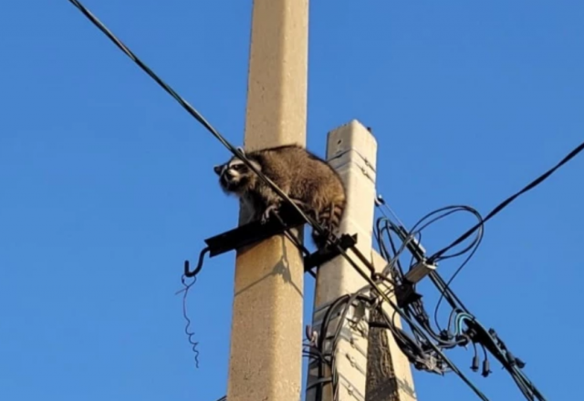 Енот сидящий на столбе, на высоте нескольких метров от земли. Такую необычную картину наблюдали жители Новокуйбышевска в одном из садовых товариществ.