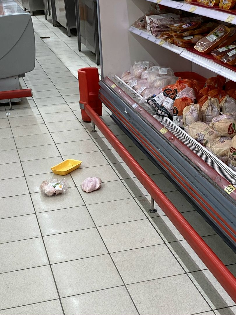 Местный житель Дмитрий оказался возмущен необычной находкой на полу возле прилавка. Куриный продукт оказался выпотрошен из упаковки и попросту лежал на кафеле. Фотографию с места событий мужчина опубликовал в соцсетях.