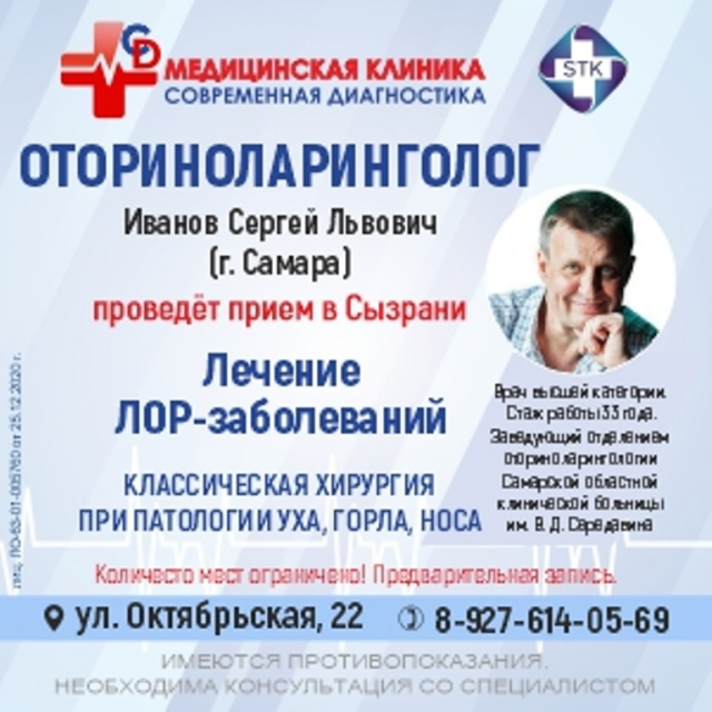 Врач высшей категории, оториноларинголог Сергей Иванов из Самары проведет прием в сызранской медицинской клинике «Современная диагностика». Опытный врач будет принимать пациентов в субботу, 5 февраля.