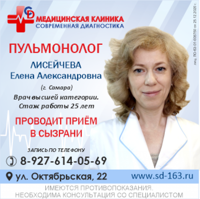 В Сызрани 12 марта в медицинской клинике «Современная диагностика» проведёт приём врач высшей категории, пульмонолог, детский пульмонолог и педиатр Лисейчева Елена Александровна.