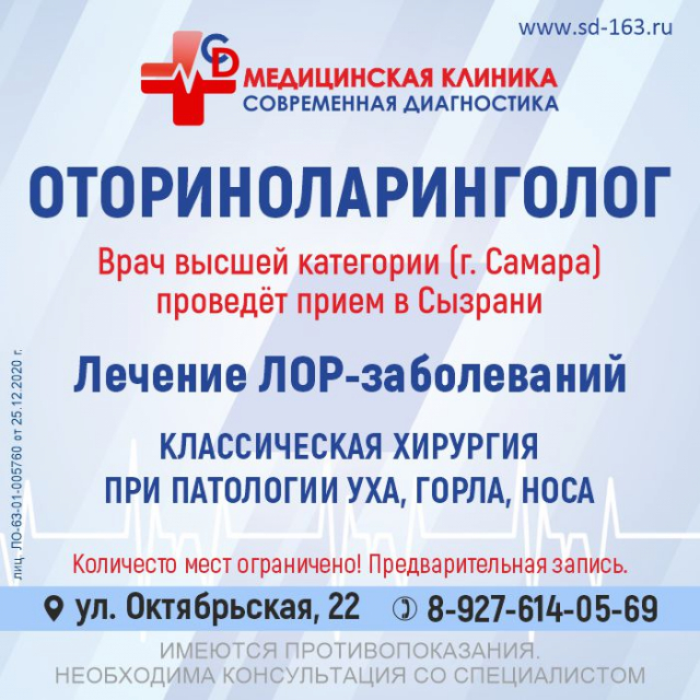 Жителям Сызрани предлагают экспертное лечение ЛОР заболеваний. 23 апреля врач высшей категории, оториноларинголог из Самары Сергей Иванов проведет прием в медицинской клинике «Современная диагностика».