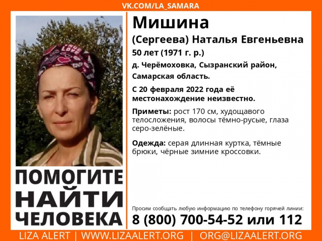 В Сызранском районе пропала Наталья Мишина (Сергеева). Это случилось в местной деревне Черемоховка сельского поселения Троицкое. Активисты "Лиза Алерт" сообщают, что о местонахождении 50-летней женщины ничего не известно с 20 февраля.
