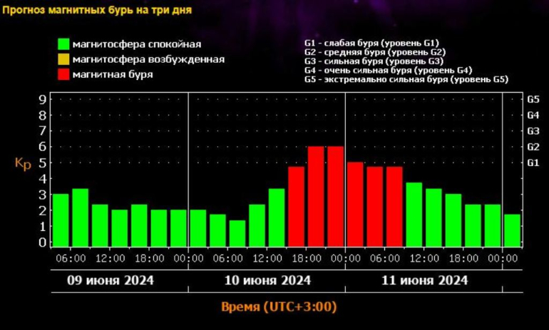 Все начнется со слабой бури уровня G1, которая за несколько часов наберет силу до уровня G2, что значит средняя магнитная буря. Утром 11 июня, ее интенсивность снизится до уровня G1, после чего геомагнитная обстановка нормализуется. Такой прогноз дает Лаборатория солнечной астрономии ИКИ и ИСЗФ.