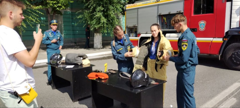 Также каждый желающий может примерить защитную экипировку сотрудников пожарной службы и понять, как непросто работать в таком облачении.