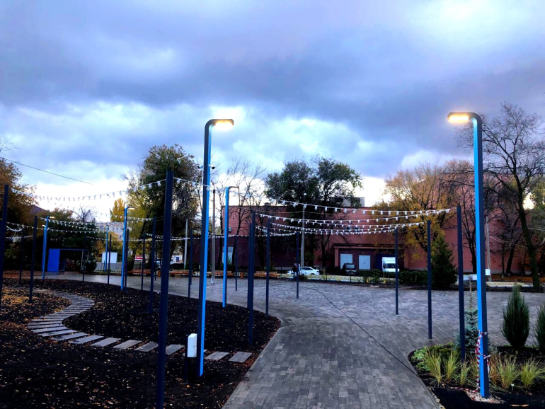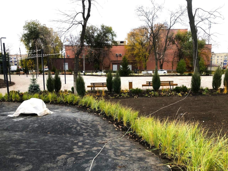 В реконструированном парке уже успели смонтировать гирлянду для декоративного освещения в темное время суток. Специалисты по ландшафтному дизайну высадили деревья и многолетние кустарники. Завершается установка бордюрного камня и укладка брусчатки, устанавливаются скамейки и урны.