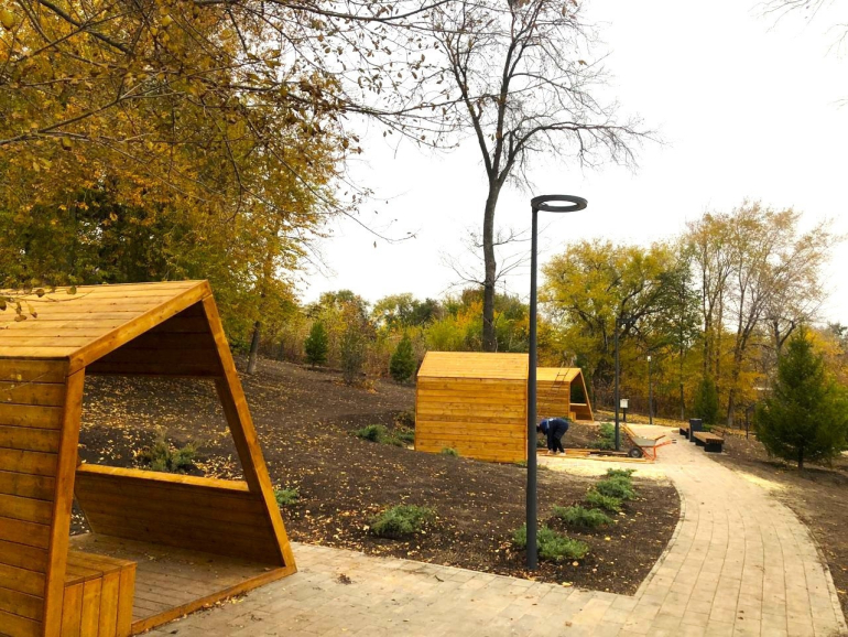 В настоящее время в парке монтируют малые архитектурные формы и детское игровое оборудование, продолжаются работы по обустройству фонтана. Также идет обшивка доской индивидуальных конструкций, в частности - беседок, площадки для йоги и других элементов.