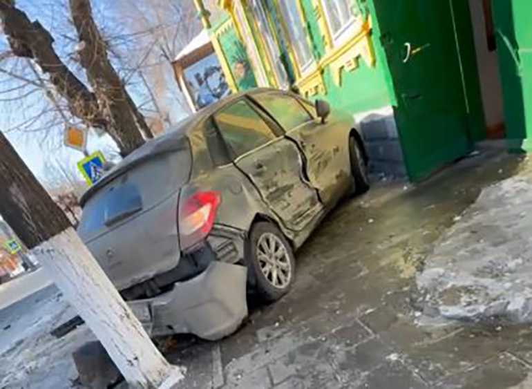 Автомобилисты говорят, что в результате столкновения с кроссовером легковушка вылетела с дороги и уперлась в здание. Кстати, это памятник архитектуры регионального значения - дом почетной гражданки Е.П. Маркушиной, построенное в стиле деревянный модерн в начале XX века. На фото трудно понять, повреждено ли здание, но видимых разрушений не видно.