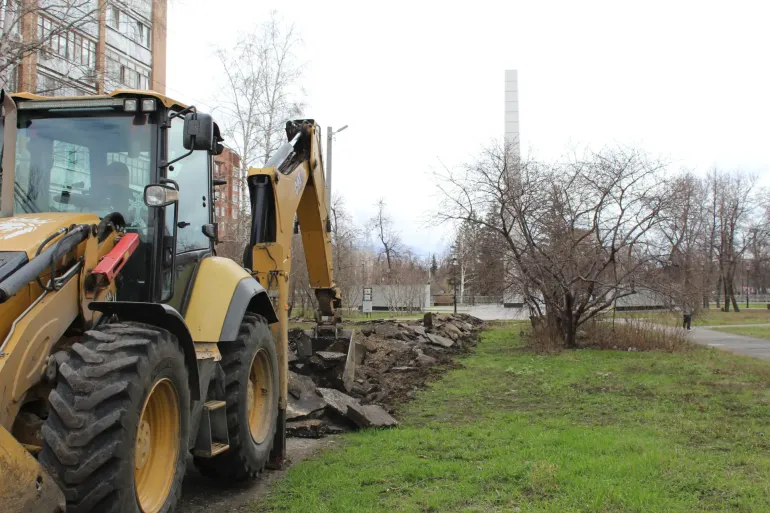 В сквере продолжат пешеходные дорожки из брусчатки, установят уличное освещение, скамейки и урны. Сейчас подрядчики занимаются подготовительными работами - производится демонтаж старого асфальта.