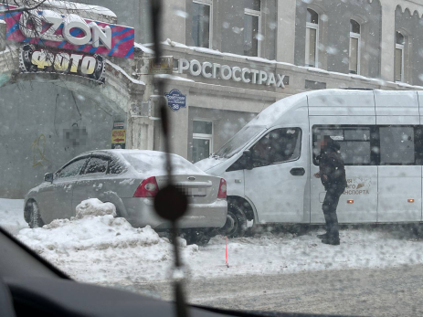 На улице Советская около дома №38 в нескольких метрах от автобусной остановки микроавтобус 35-го маршрута врезался в «Форд Фокус». Водитель иномарки, судя по всему, намеревался проехать через арку в двор.