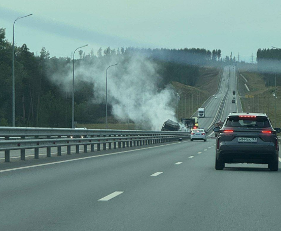 На фото видно, что горящий грузовик перекрыл часть трассы. Подробности происшествия выясняются.