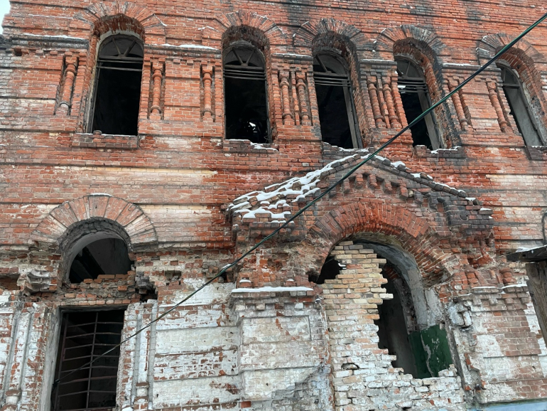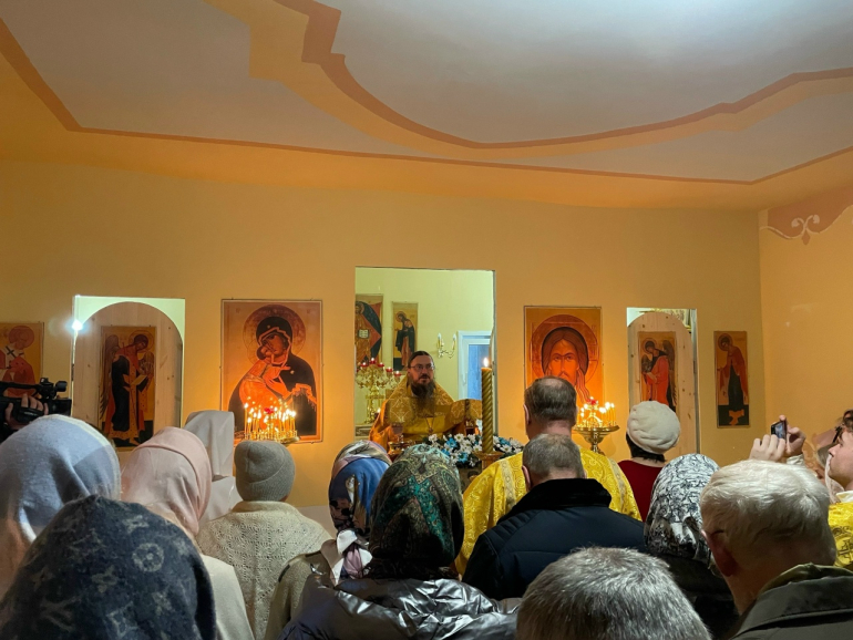 Для проведения сегодняшней службы внутри сохранившихся кирпичных стен храма построили небольшое деревянное помещение. Службы теперь здесь будут проходить каждое воскресенье.