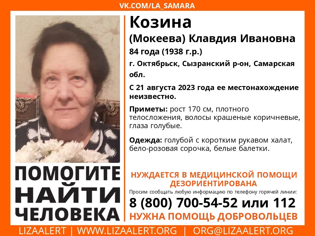 В Самарской области ищут 84-летнюю Клавдию Козину. Пожилая женщина бесследно исчезла в понедельник, 21 августа, в городе Октябрьске. Об этом сообщает поисковый отряд «Лиза Алерт».